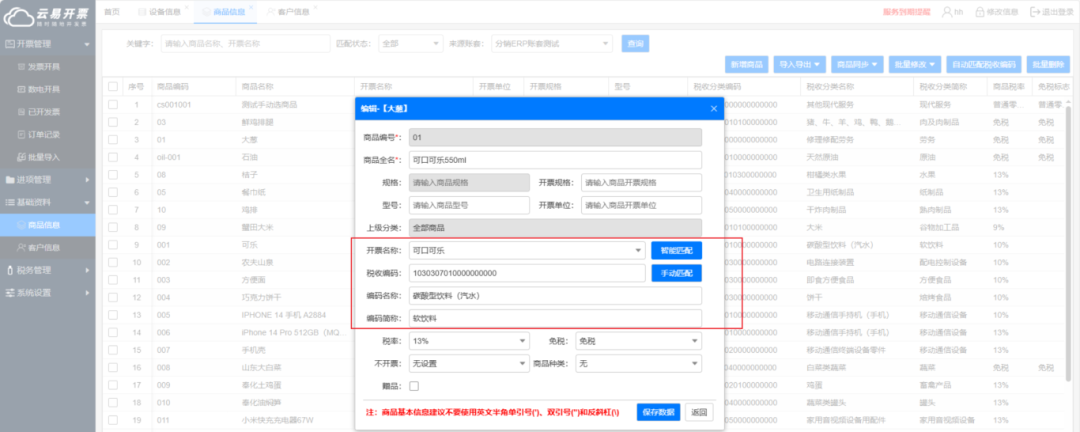 开票时候的商品明细多数是手动一条一条选择,每次开票都需要一个一个对应,操作非常麻烦。甚至有些商品没有维护过开票信息,还要临时调整。