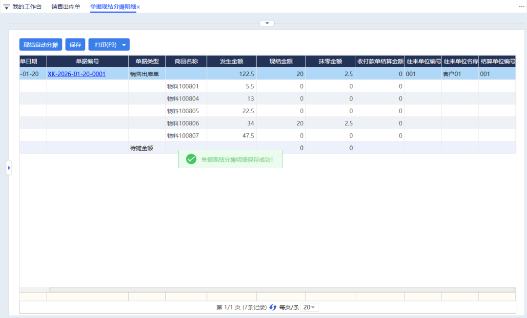 单据过账时,将按照商品明细顺序,优先将“现结金额”和“抹零金额”进行自动分摊。完成分摊后,用户仍可在现有金额基础上,继续进行按商品结算的操作。